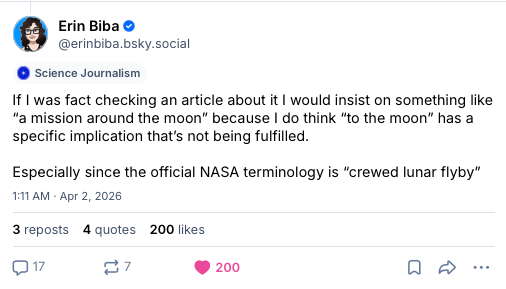 Amid all the excitement over the launch, this question is what Bluesky has decided to concern itself with. And it has uncovered what is, in my view, a revealing pattern: Scientists and space nerds mostly favored saying Artemis II is going "to the Moon." Other folks — including science journalists — preferred alternatives like "around the Moon" and "lunar flyby."