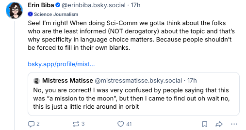 By far the most exhaustive argument against saying "to the Moon" was laid out by freelance science journalist — and fact-checker, that's relevant — Erin Biba. I can't embed Erin's post because it is only visible to logged-in viewers. But here's a screenshot to get you started and a link to a thread explaining the position for Bluesky folk with accounts.