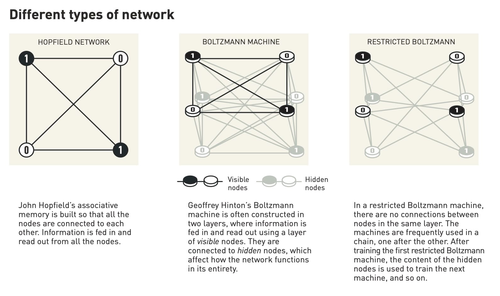 Boltzmann machines were among the first neural networks designed to dream up new data rather than simply remember it — an early form of generative AI. They typically have two layers of nodes: a visible layer that takes inputs and gives outputs, and a hidden layer that represents patterns internally. By adjusting how strongly different nodes interact with each other, the network can absorb statistical patterns that appear over and over again in their inputs and output similar patterns. Restricted Boltzmann machines are leaner versions that cut down on internal chatter: visible nodes connect only to hidden ones, not to each other. These trim networks played a vital role in the 1990s AI renaissance after Hinton and colleagues showed that stacks of them could be used to "pretrain" deep neural networks and dramatically boost their performance.